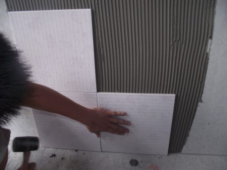 8. 可用像膠錘輔助施工(已加水攪拌好的瓷磚膠最好在2小時內(nèi)完,切忌將已干固的瓷磚膠再加混合攪拌使用。施工可用像膠錘輔助完成,24小時后,方可踏入或填縫。)